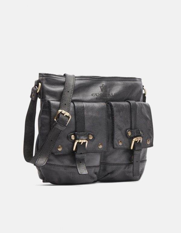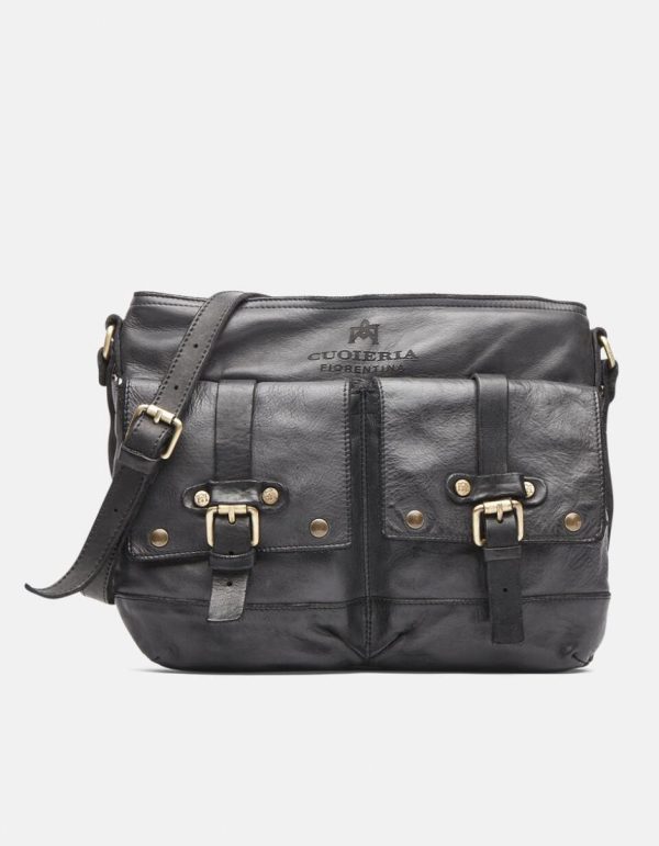 Dettagli esterni: tasche frontali con chiusura a bottone e fibbia e logo stampato a fuoco.