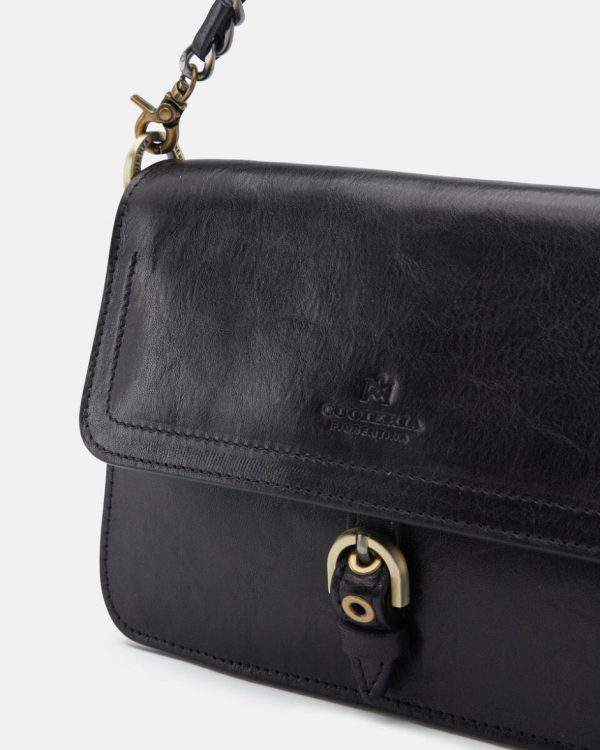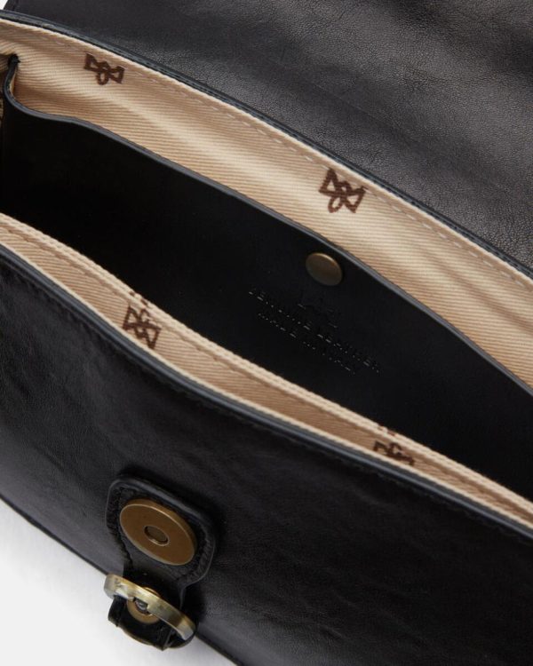 Dettagli esterni: chiusura con patta e bottone magnetico con logo stampato a fuoco.