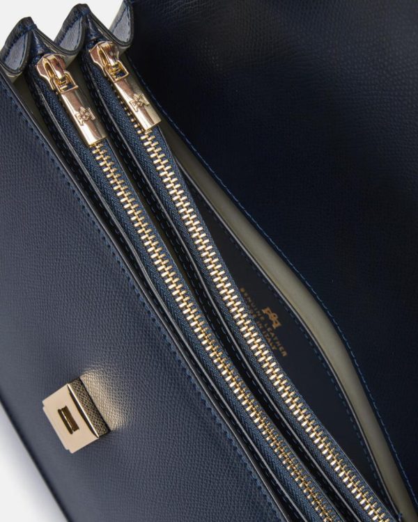 Dettagli interni: tre scomparti divisi da due tasche con zip e taschino laterale.