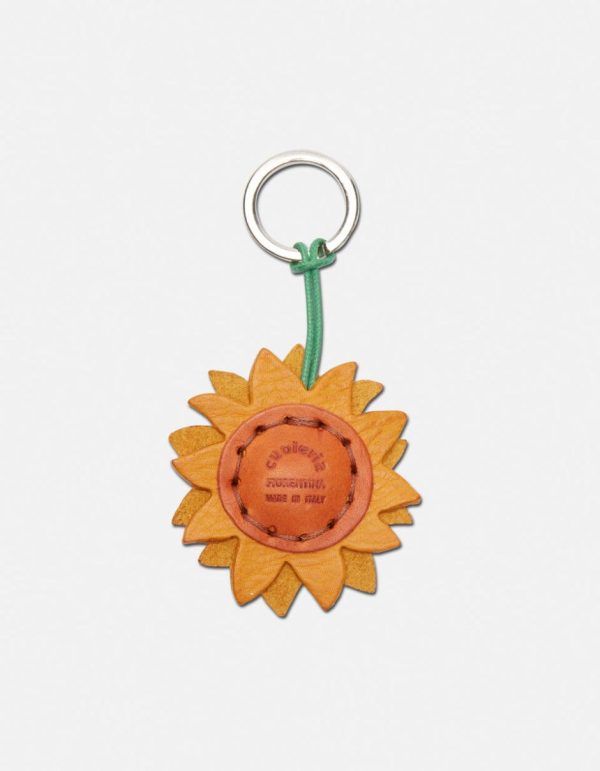 Grazioso portachiavi con soggetto Girasole ideale per uso quotidiano. Realizzato con pellame conciato al vegetale di primissima qualità, unisce la morbidezza del pellame all’estrosità del disegno reso prezioso dalle cuciture applicate artigianalmente.
