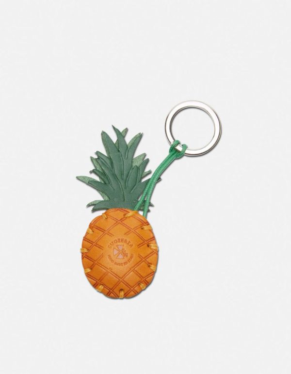 Grazioso portachiavi a anello in cuoio con soggetto Ananas ideale per uso quotidiano. Realizzato con pellame conciato al vegetale di primissima qualità, unisce la morbidezza del pellame all’estrosità del disegno reso prezioso dalle cuciture applicate artigianalmente.
