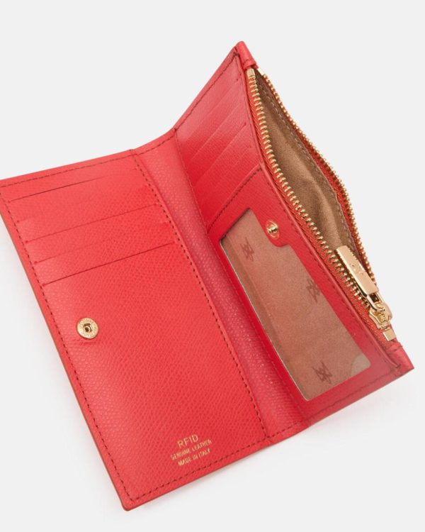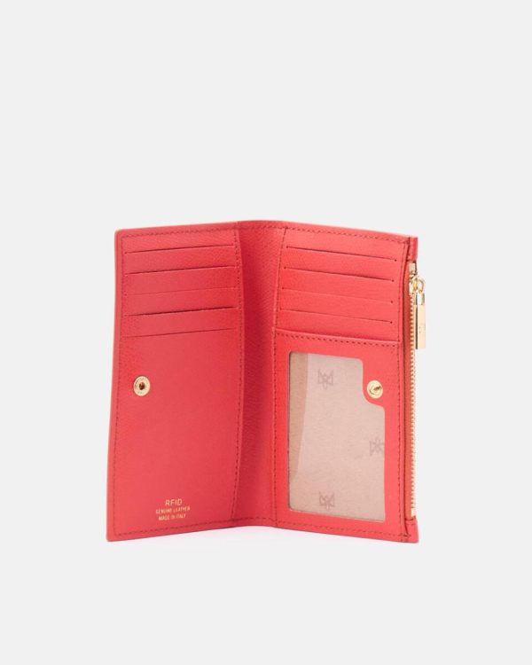 Dettagli interni: 10 slot porta carte, 2 tasche laterali e chiusura con patta e bottone.