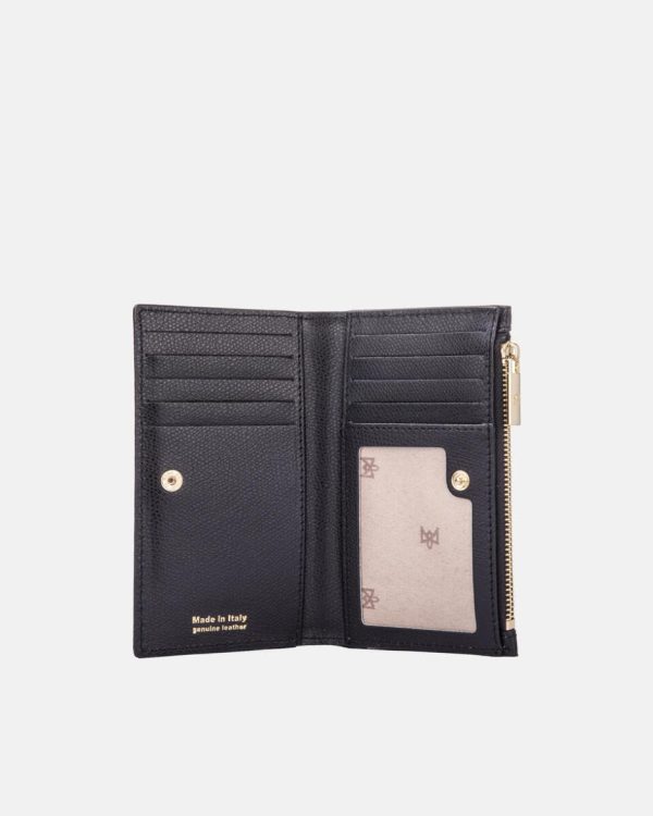 Dettagli interni: 10 slot porta carte, 2 tasche laterali e chiusura con patta e bottone.