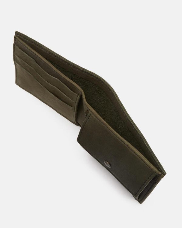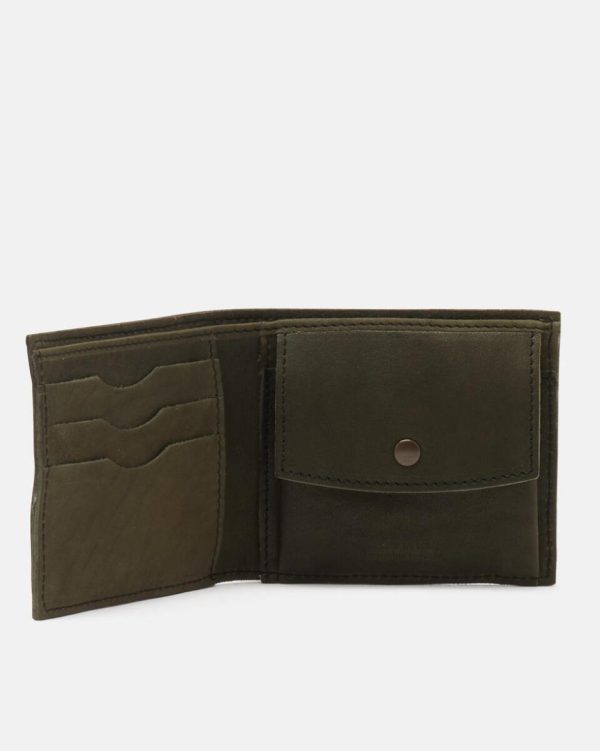 Dettagli interni: 3 slot porta carte, scomparto banconote sfoderato, due tasche e porta monete con chiusura a bottone.