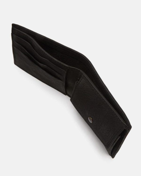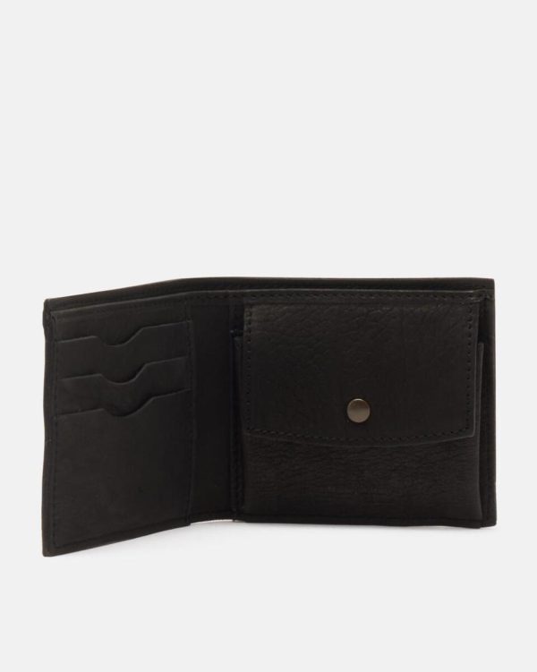 Dettagli interni: 3 slot porta carte, scomparto banconote sfoderato, due tasche e porta monete con chiusura a bottone.