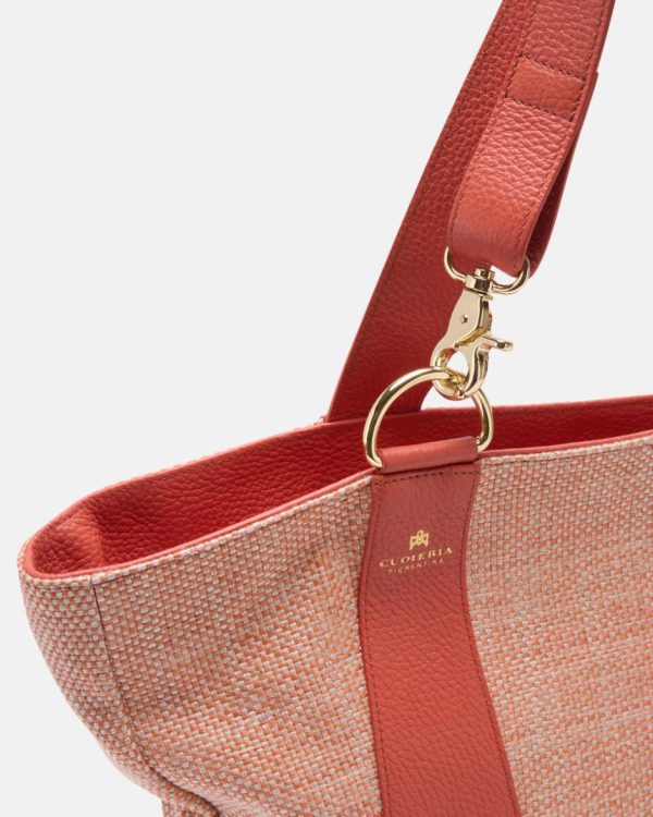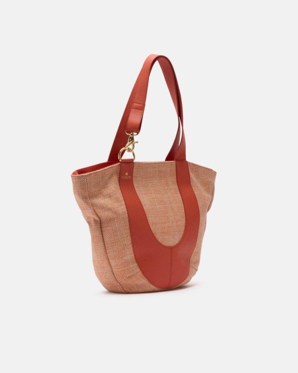 Tessuto Jacquard misto cotone, lino e rafia, dalla trama consistente e ricca e un particolare intreccio in colorazioni neutre, da indossare ogni giorno. I dettagli sono realizzati in pelle primo fiore.