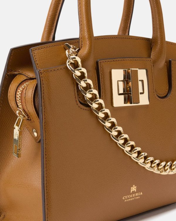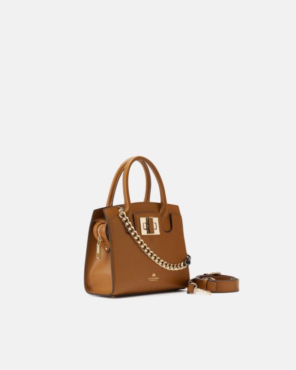 Dettagli esterni: tasca frontale dotata di chiusura girevole con dettaglio in pelle e logo stampato a fuoco colore oro.