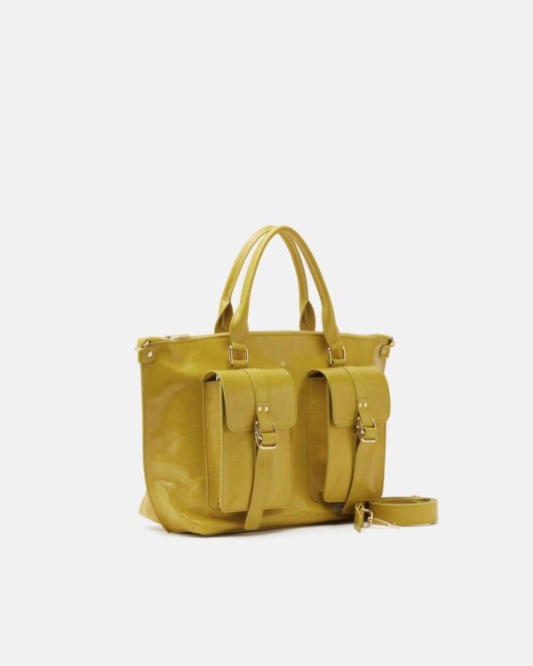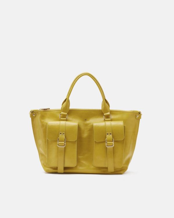 Dettagli esterni:tasche frontali arricchite da fibbie regolabili e logo stampato a fuoco colore oro.